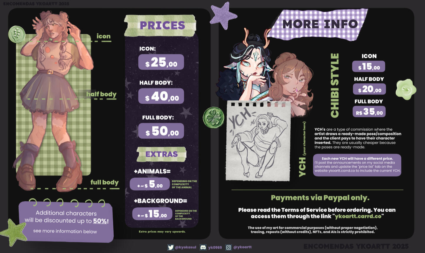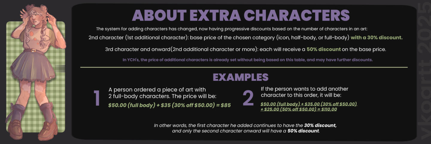 ✘ Anything that makes me uncomfortable. (Tell me your idea so I can think about it)→ Contact me and let me know your idea so I can evaluate itPAYMENTSAfter negotiating the price, I offer two payment methods:1 - 50% of the amount before starting the drawing and 50% of the amount after finishing the artwork (before delivering it to you).2 - 100% of the amount at the beginning of the drawing.I do not offer refunds, but we can negotiate the amount in urgent cases with proof.REVISIONS√ There will be TWO checkpoints during the process:- Sketch: I will provide a rough version of the artwork. You may change the expression/some key features of the draft. I recommend providing a reference if you want to make major changes.- Colored: I will provide a colored version + line art, and you can change anything you want (except the pose, as this should be decided during the sketch phase).√ Please, gather all the changes you want to make before sending them to me at each stage. It will be easier for me to make changes, and it will also be better for you to receive one altered drawing than several.√ Please be aware that I WILL NOT change the pose during the color + line art stage, nor during the final rendering.DEADLINES AND DELIVERY√ I promise to deliver the final art within a maximum of 2 months. This deadline may vary if the order queue is very full, and if that happens, I will let you know!